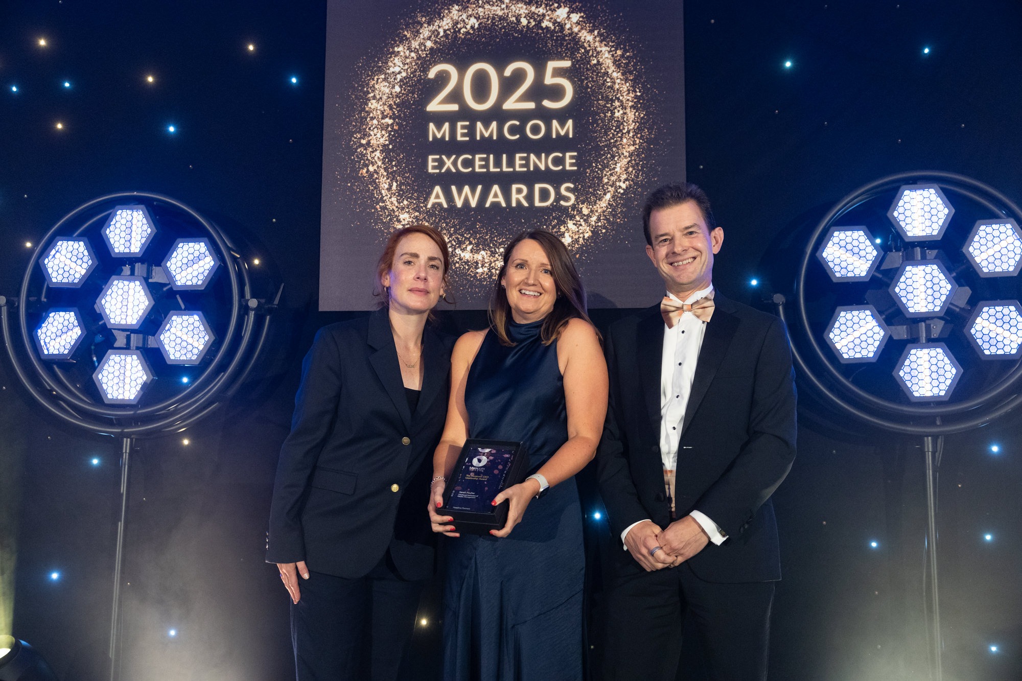 Sarah Poulter collecting her trophy at the 2025 Memcom Excellence Awards on 25th September 2025.